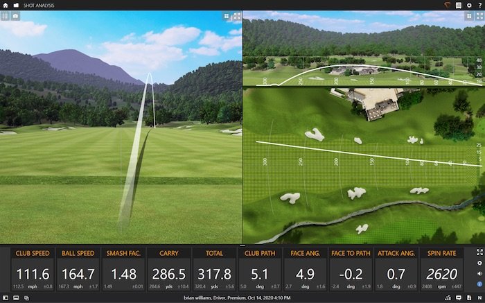 Instant feedback on 20+ data points including Carry, Total Distance, Launch Angle, and Spin Rate.
